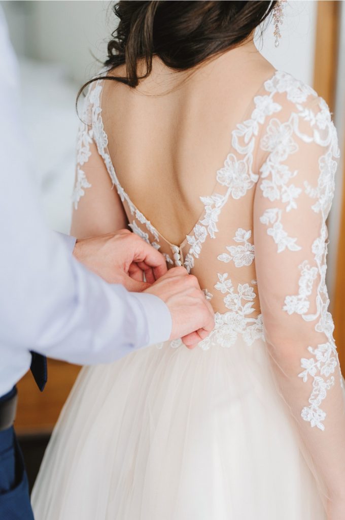 Woman helping the bride zip up her simple white wedding gown near a window.